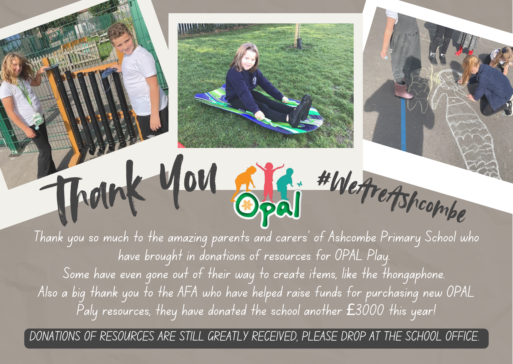 Thank you so much to the amazing parents and carers’ of Ashcombe Primary School who have brought in donations of resources for OPAL Play.