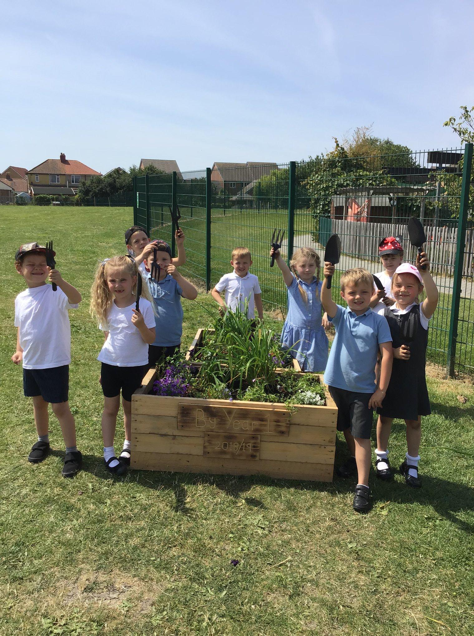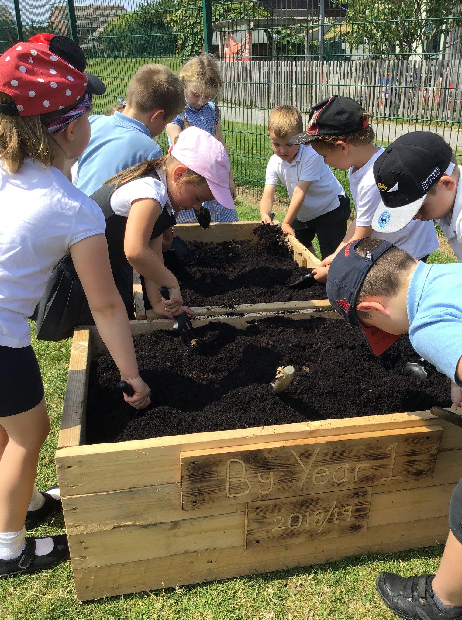 The school allotment and pond area is a fantastic outdoor learning space and is available for use by pupils in all years.  We grow a variety of flowers and vegetables from seed or bulbs.  Pupils in year one and two are involved in sowing seeds indoors at the start of the growing season while the older children participate in activities such as digging, weeding, sweeping and in the Autumn leaf collection for the leaf mould heap. Looking after the allotment gives pupils the opportunity to learn how to use tools safely and understand how plants grow best. We have a thriving wildlife pond full of newts and frogs which the pupils can study by careful pond dipping.  There is a covered seating/table area that can be used for outdoor learning groups and individual pupils accompanied by an adult can use the space to spend time in a relaxing and peaceful environment.  We grow flower and vegetable plants for an annual sale and pupils plant up the popular hanging baskets for sale at the Summer Fayre.  The produce from the allotment is either picked and eaten straight way by pupils (peas and raspberries) or taken home and shared with their families.